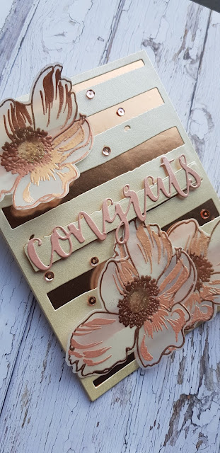 I wanted the rest of the card to be simple, I didn't want to take anything away from the flowers, as they are the focal point of the card. The gold and peach screamed wedding or anniversary to me, so that was the plan, make a Congrats card, as it could be for both!